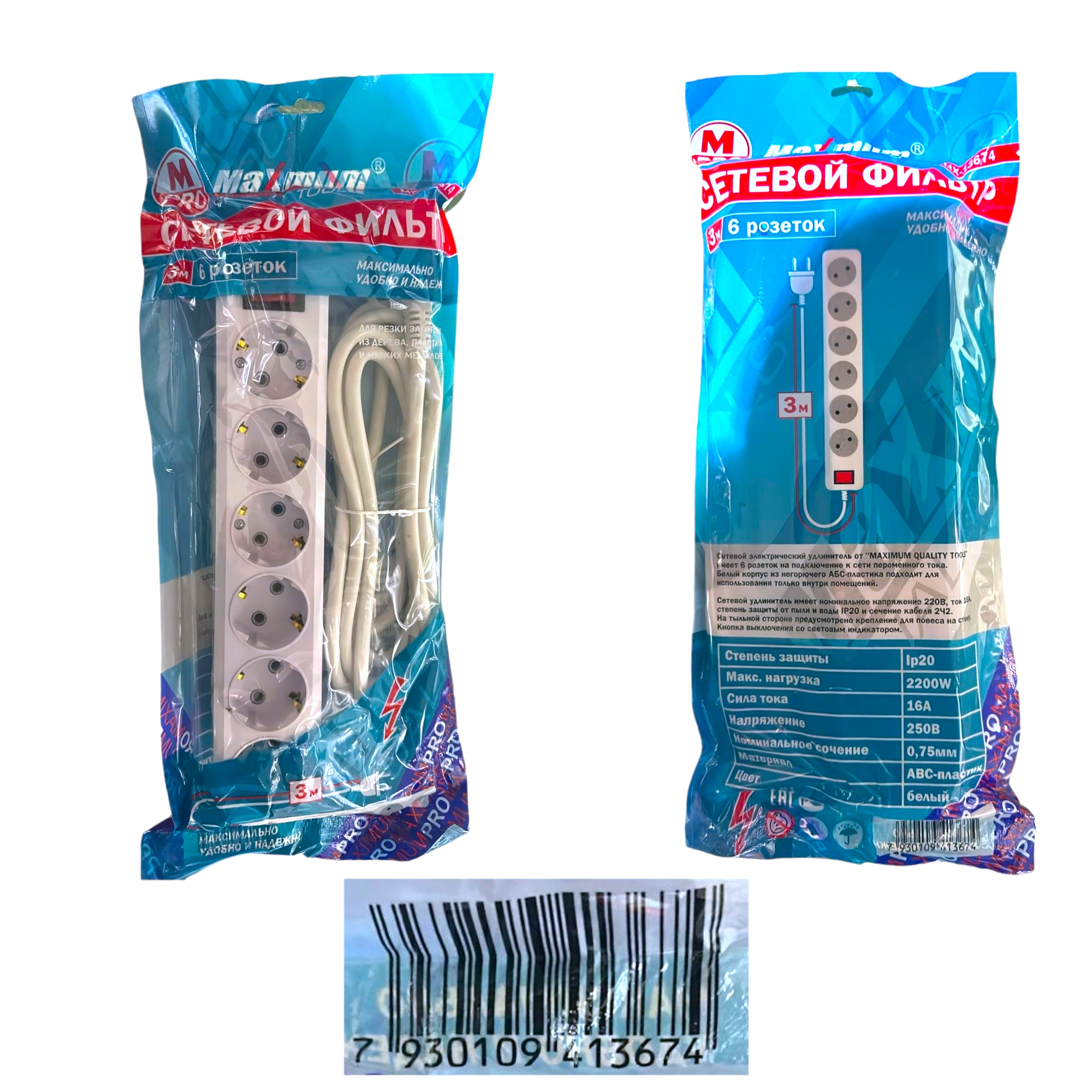 Сетевой электрический фильтр 3 метра от "MAXIMUM QUALITY TOOLS" имеет 6 розеток на подключение к сети переменного тока. Удлинитель на 6 розеток предназначен для бытовых приборов. Белый корпус из негорючего АБС-пластика подходит для использования только внутри помещений.
