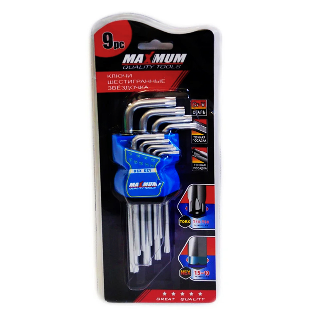 Набор ключей TORX содержит 9 специализированных инструментов 1.5-10 мм диаметром изогнутой формы с двусторонним исполнением.