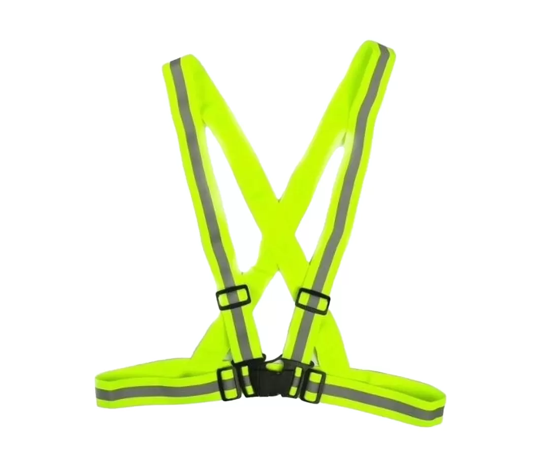 Ремень сигнальный универсальный салатовый с диагональными наплечными лямками, оснащен световозвращающим элементом в виде центральной полоски и изготовлен из сшитых между собой широких резинок 4 см. с регулируемыми пряжками-бегунками и застежкой фастекс.
